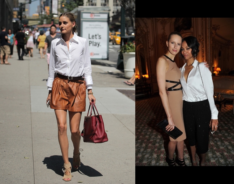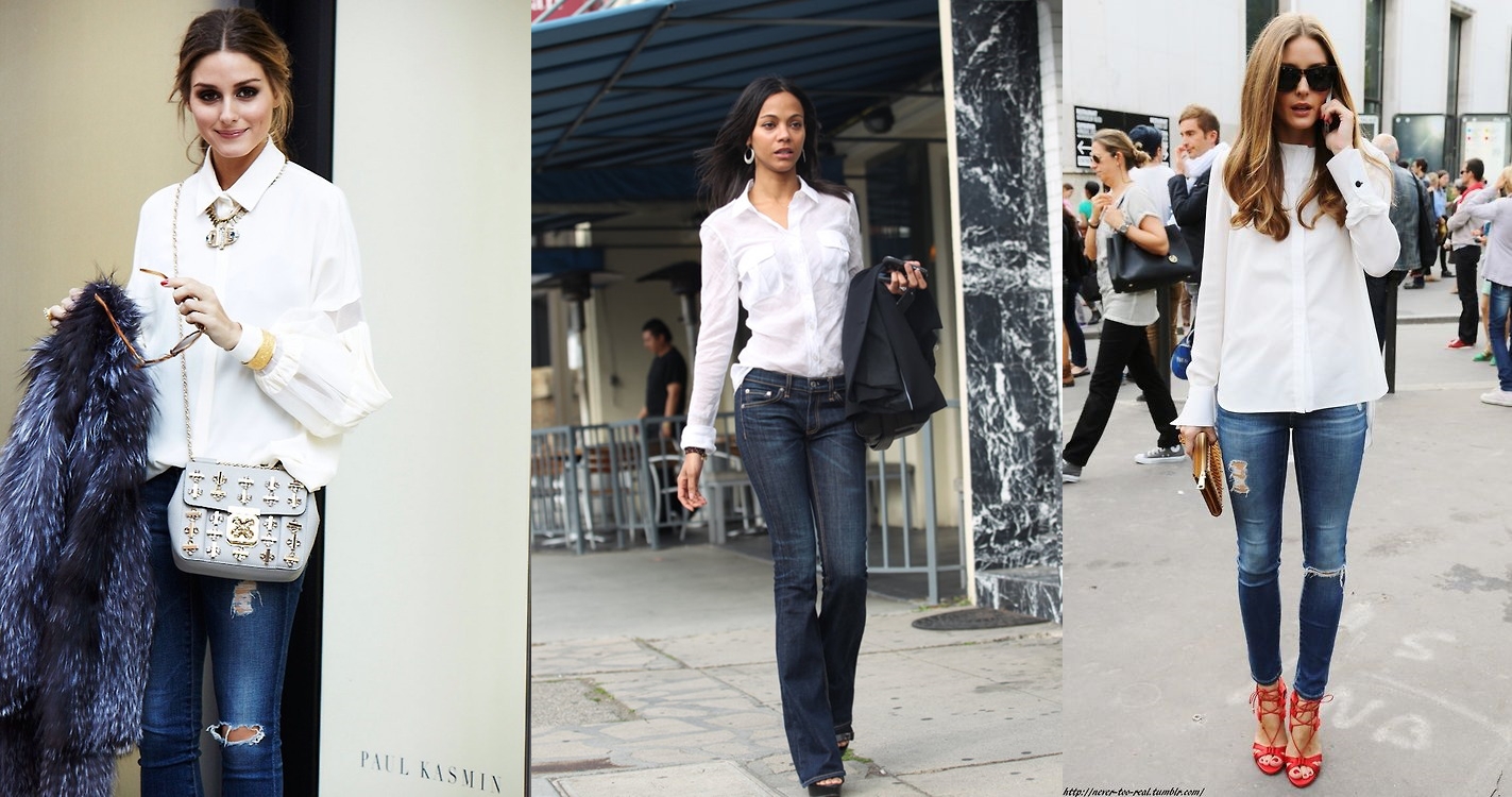 Levo i desno: Olivia Palermo u farmericama i beloj košulji, Sredina: Zoe Saldana u farmericama i beloj košulji
