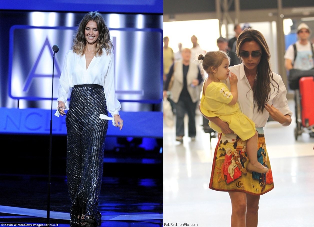 Levo: Jessica Alba u dugoj suknji i beloj košulji, Desno: Victoria Beckam u šarenoj suknji i beloj košulji